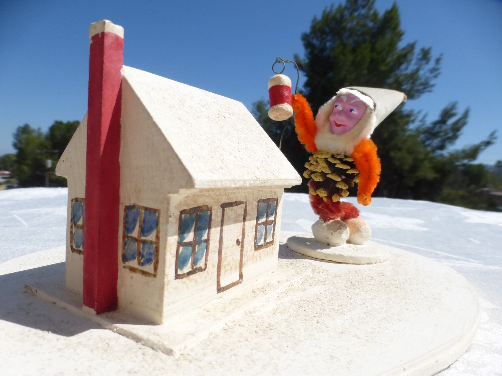 Title (ebay affiliate link): VINTAGE CARDBOARD PUTZ STYLE CHRISTMAS HOUSE AND PINECONE ELF W/LANTERN Figurine