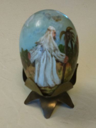 Antique Victorian Milk Glass Egg Hand Blown Pontil - Painted Religious w Stand
