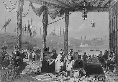 1840s ENGRAVING OF TURKISH COFFEE SHOP IN CONSTANTINOPLE OTTOMAN EMPIRE TURKEY