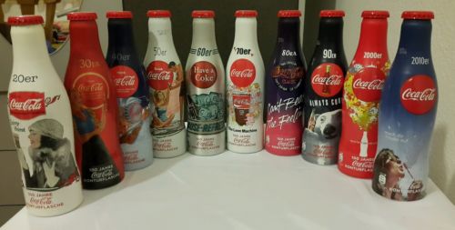 Coca cola alu bottle set from germany. 10 full bottles. Little dents and scratc