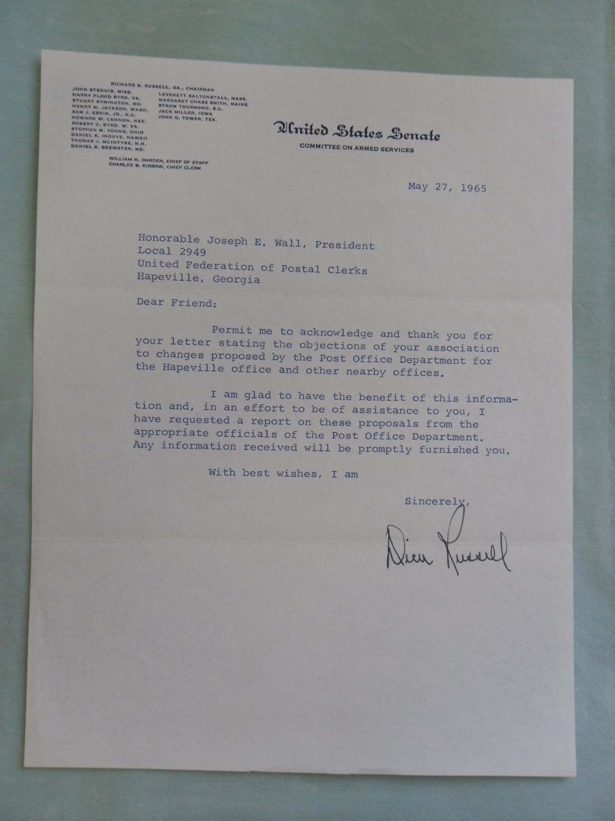 Title (ebay affiliate link): 1965 Richard Russell Senator/Committee On Armed Services Chairman Signed Letter