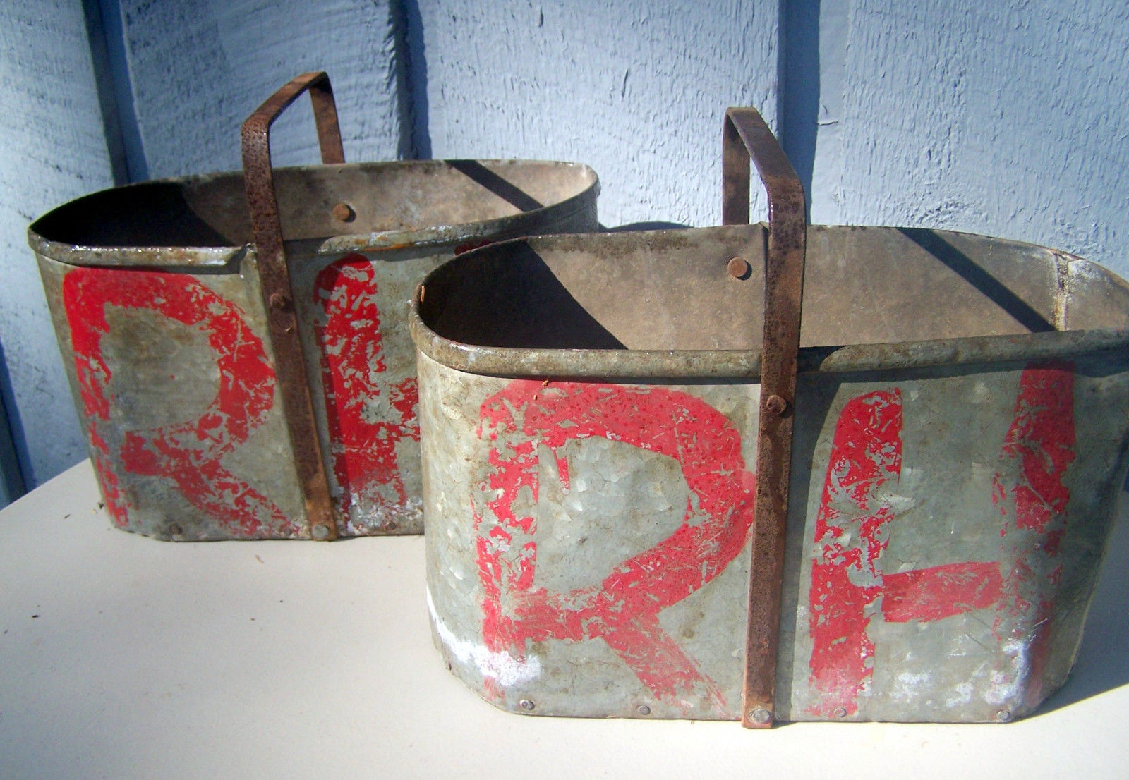2 primitive METAL BERRY CHERRY PICKING PAIL BUCKET original old Garden Orchard