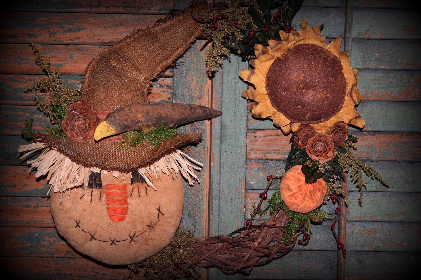 Title (ebay affiliate link): Primitive Grungy Fall Scarecrow & Sunflower Wreath with Crow