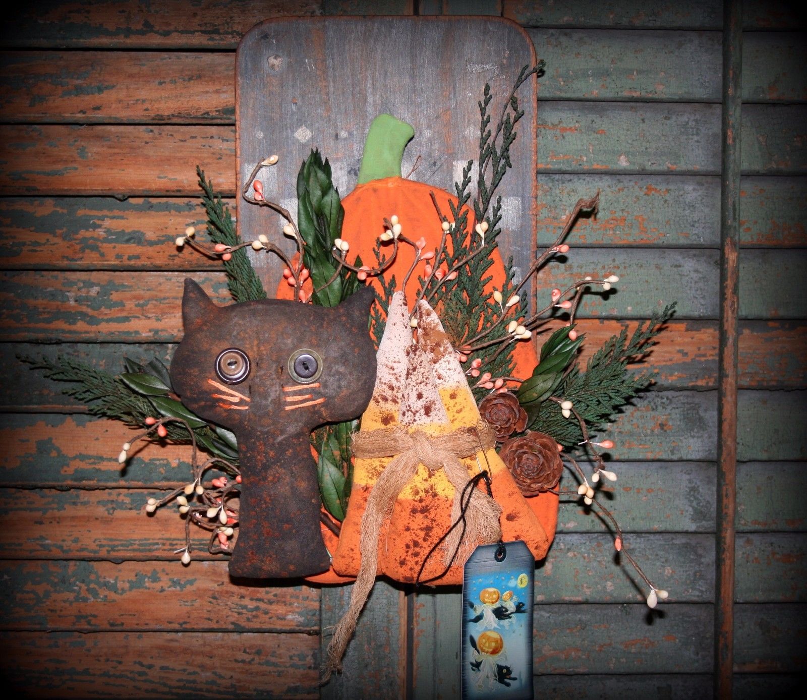 Title (ebay affiliate link): Primitive Grungy Halloween Black Cat, Pumpkin and Candy Corn wall hanger