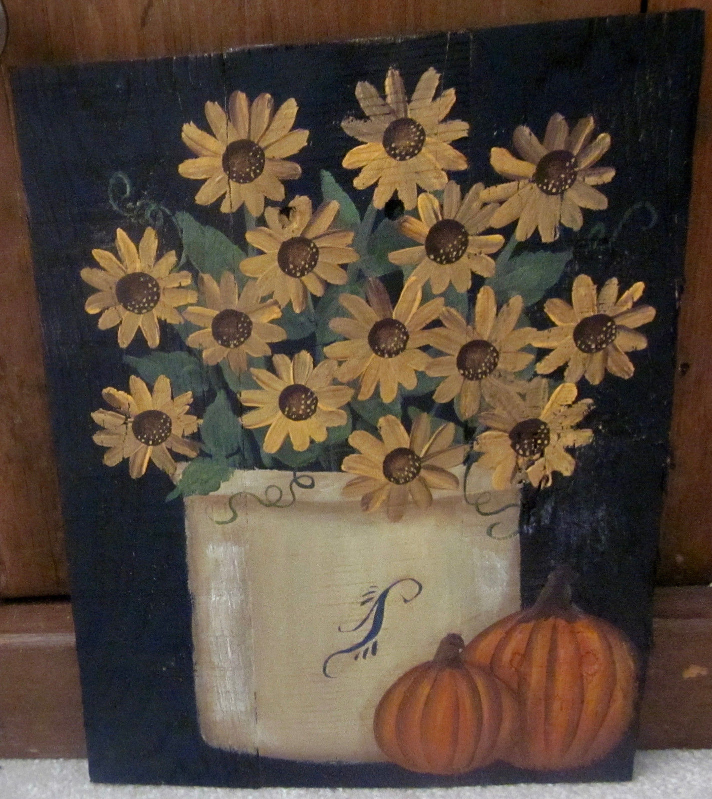 Title (ebay affiliate link): *~*PRIMITIVE*~* HP FOLK ART CROCK OF SUNFLOWERS * PUMPKINS * OLD RECLAIMED WOOD