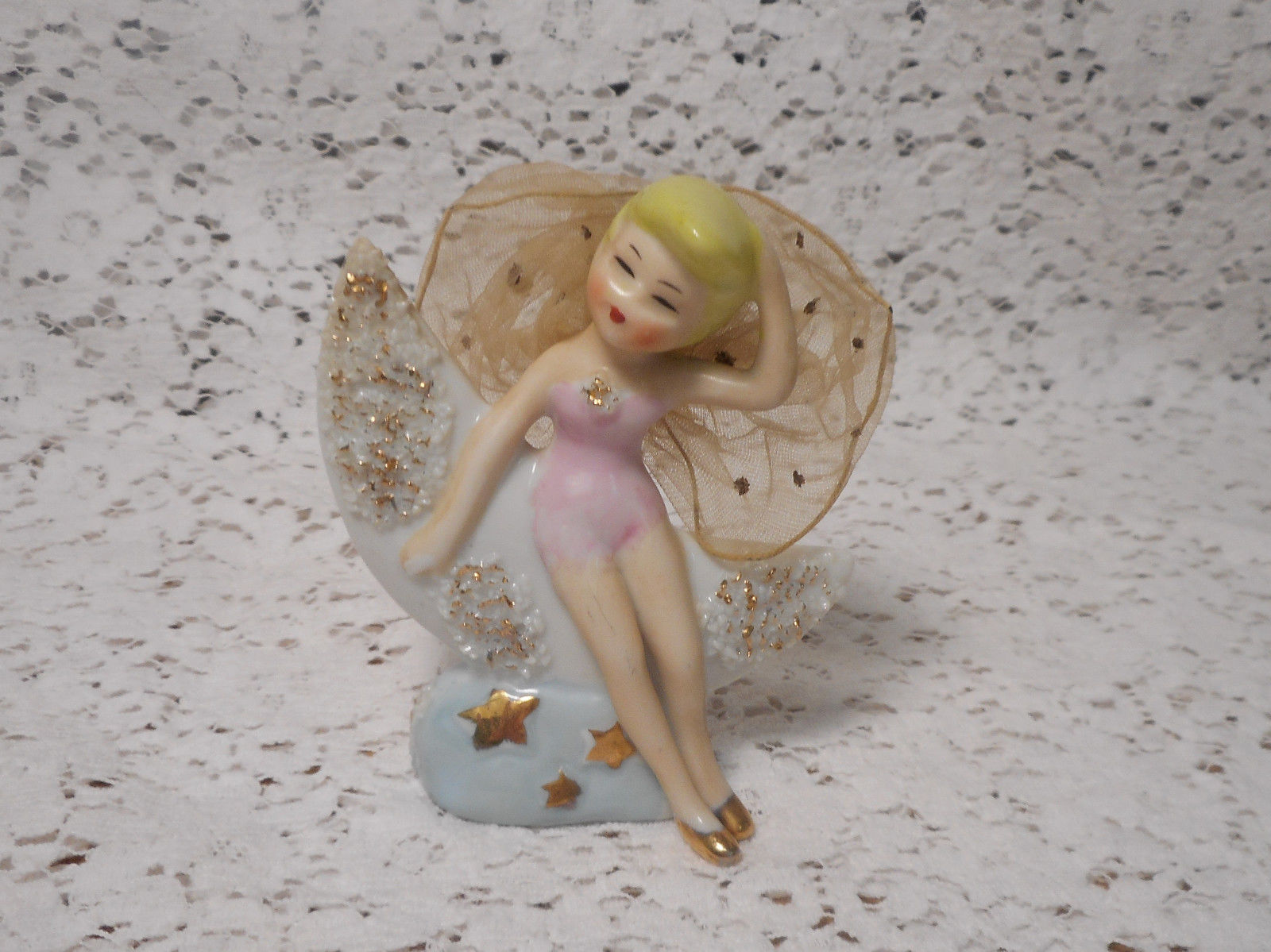 Title (ebay affiliate link): Vintage Porcelain Woman Angel Sitting on the Crescent Moon - Net Fabric Wings