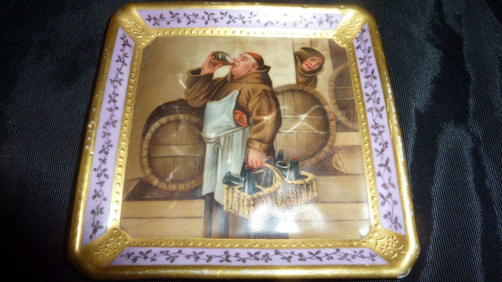 Title (ebay affiliate link): 19 c. Hand painted antique Monk drinking wine on the sly Porcelain whimsy dish