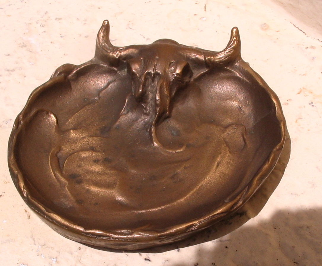 Vintage Bronze Western Cowboy Cows Round Skull Tray Soap / Ash N/R