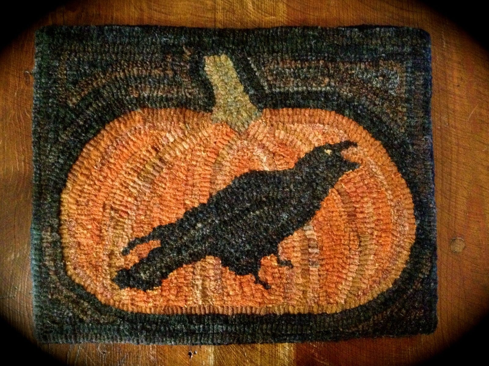 Title (ebay affiliate link): Hooked Rug on Linen - Nevermore Crow on Pumpkin Primitive Folk Art OOAK