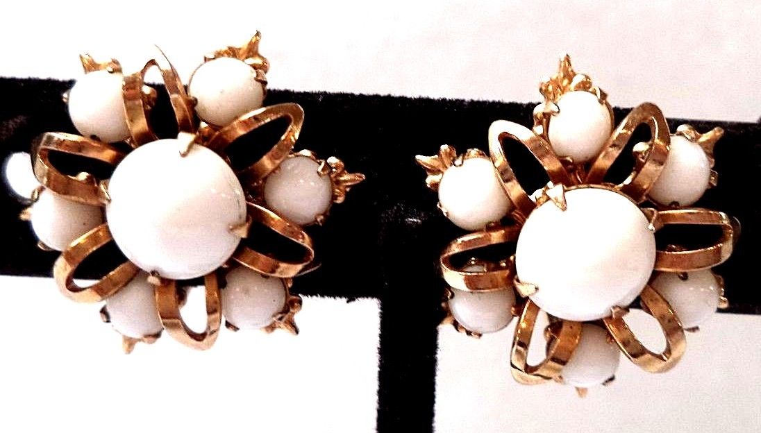 Title (ebay affiliate link): STUNNING VINTAGE ESTATE GOLD TONE MILK GLASS CAB FLOWER EARRINGS!!! 6750M