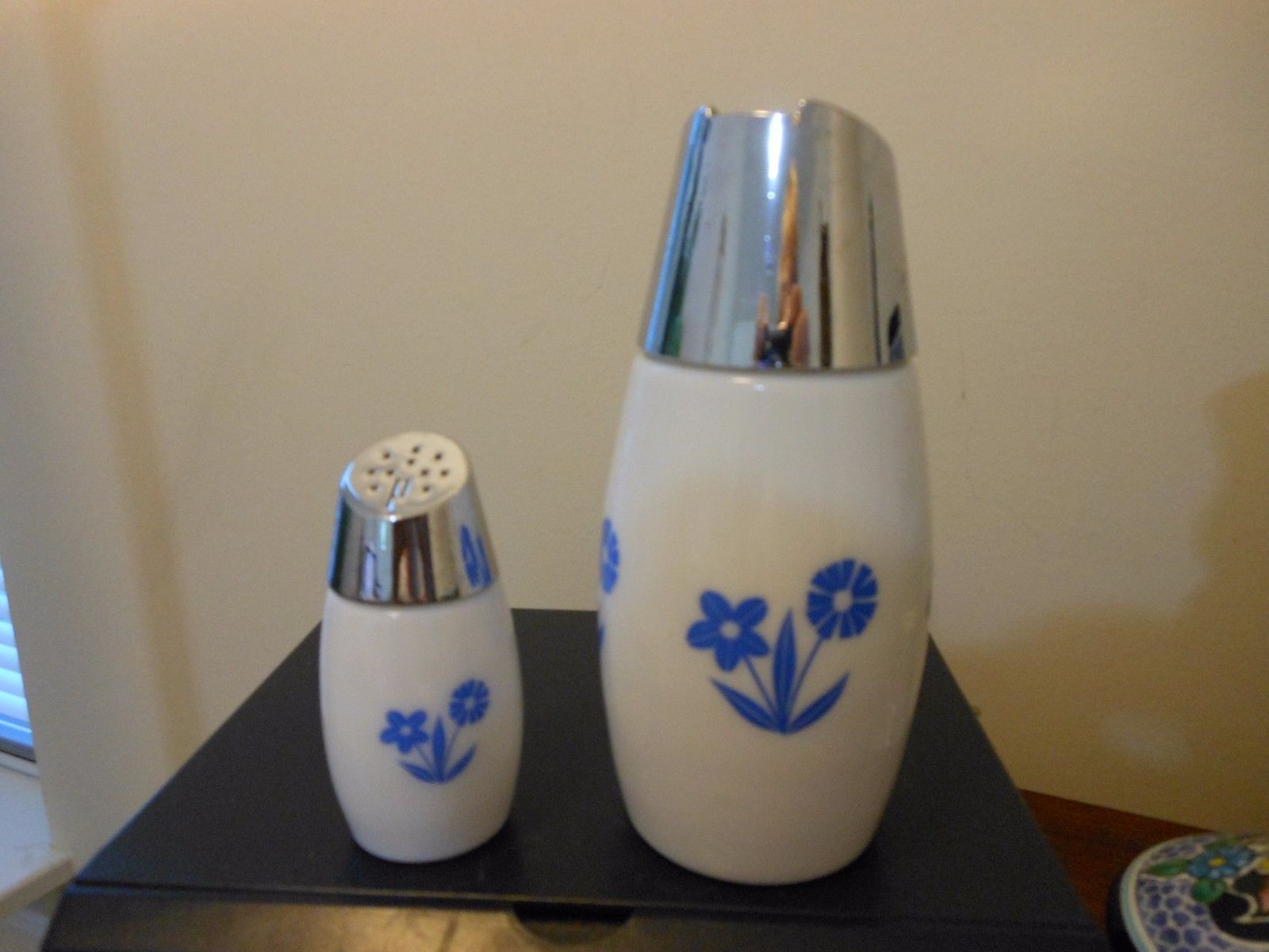 Title (ebay affiliate link): Gemco White Milk Glass Blue Flower Cornflower Sugar Dispenser & Pepper shaker