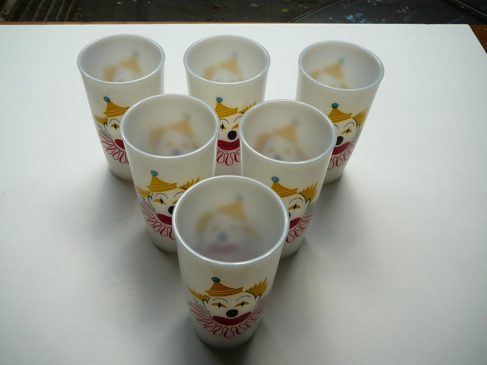 Title (ebay affiliate link): Hazel Atlas Vintage Tumblers White Milk Glass Clowns 5" Tall