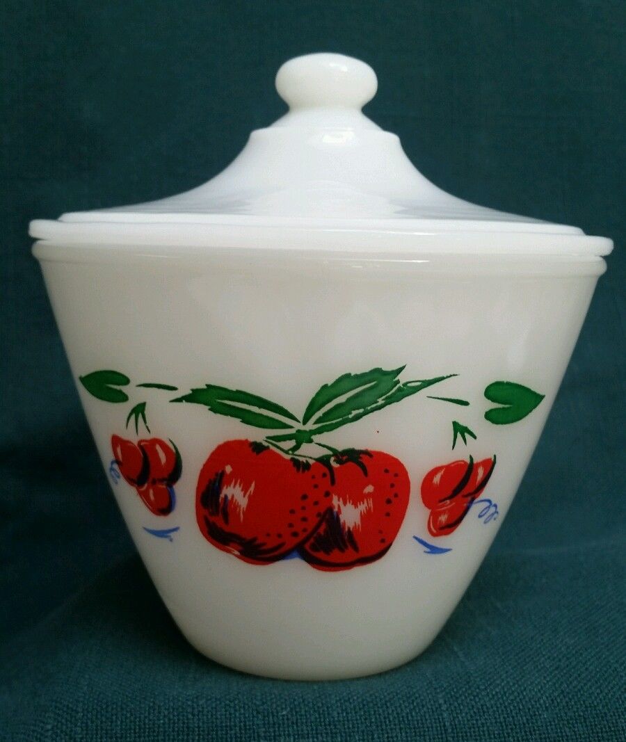 Title (ebay affiliate link): Vintage 1940s Fire King Milk Glass Apples and Cherries Grease Jar with Lid
