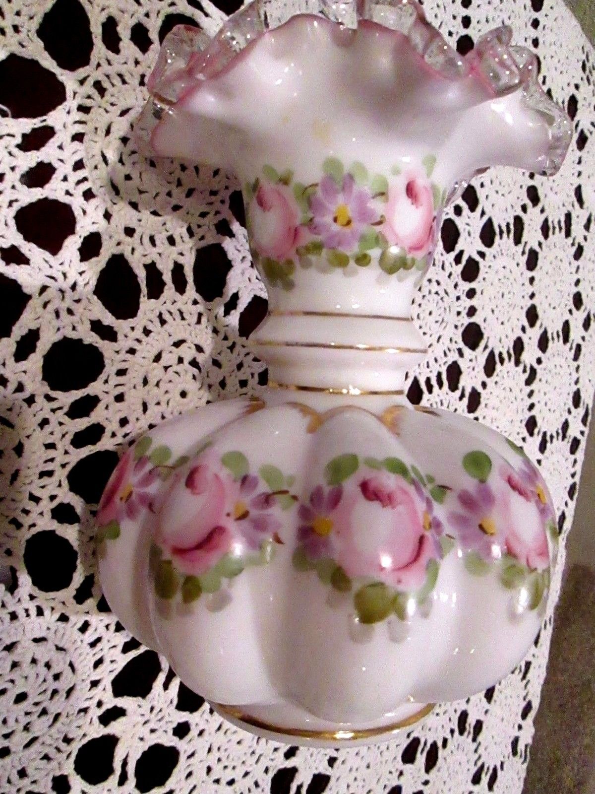 Title (ebay affiliate link): FENTON MILK GLASS CHARLTON DECORATED PEACH CREST VASE SELLING NO RESERVE!