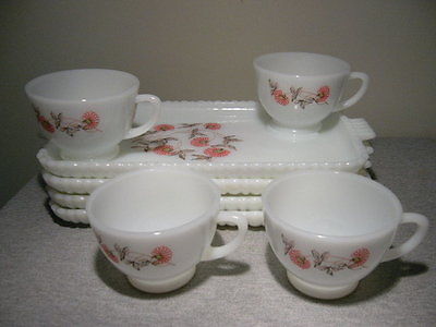 VINTAGE 60s ANCHOR HOCKING Fire King MILK GLASS Fleurette SNACK SETS