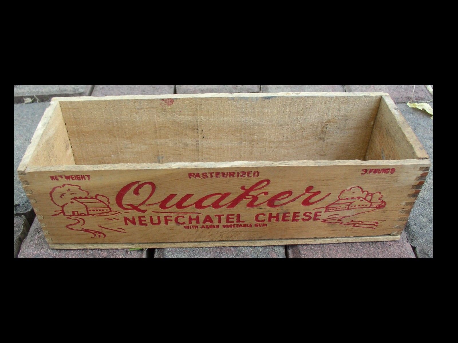 Title (ebay affiliate link): Vintage Quaker Neufchatel 3 Lbs. Wooden Process Cheese Box Red Marking