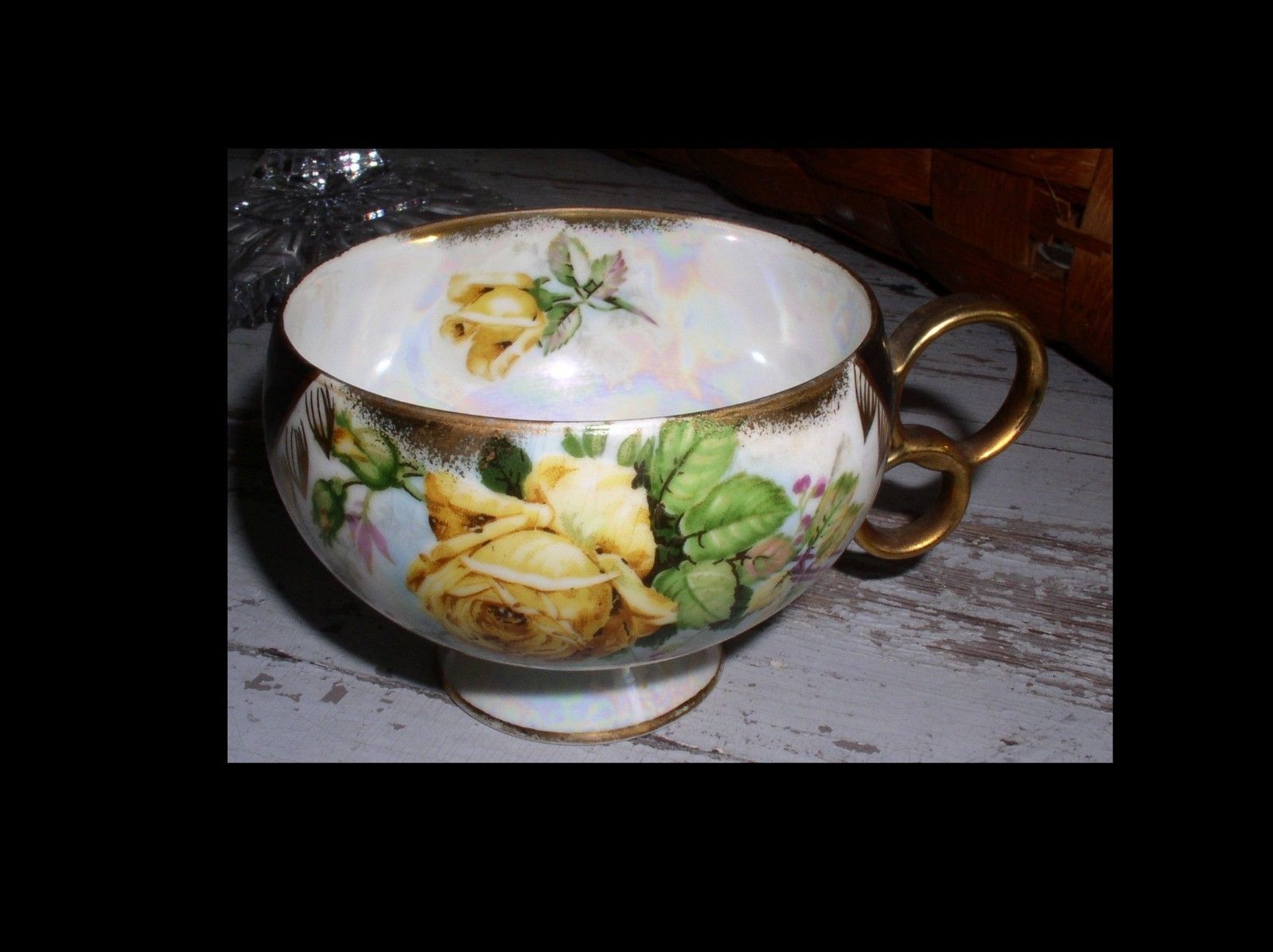 Title (ebay affiliate link): Hand Painted Footed Iridescent Luster Ware TEA CUP Yellow Roses/Gold Trim