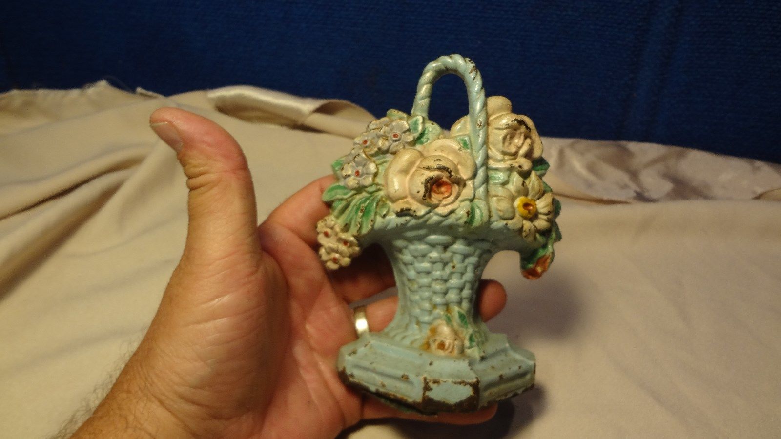 VINTAGE CAST IRON FLOWER BASKET FLORAL DOOR STOP