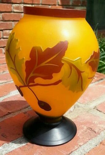 Vintage Cameo Glass Vase Oak Leaves and Acorns Gold Green Brown