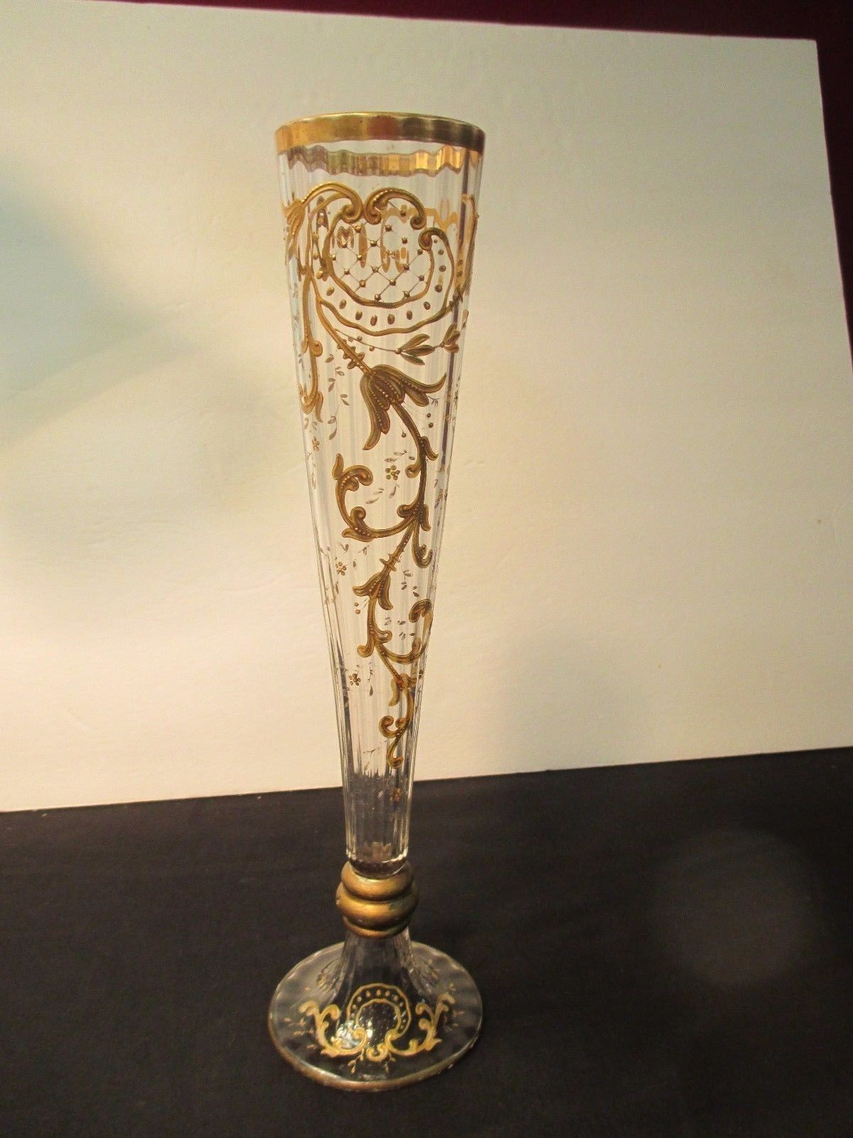 ANTIQUE 13" VICTORIAN GLASS TRUMPET VASE APPLIED ENAMEL