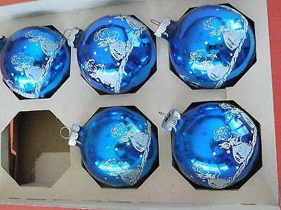 5 VINTAGE SHINY BRITE Christmas Ornaments BLUE with Stencil Angels in Box 8.5"