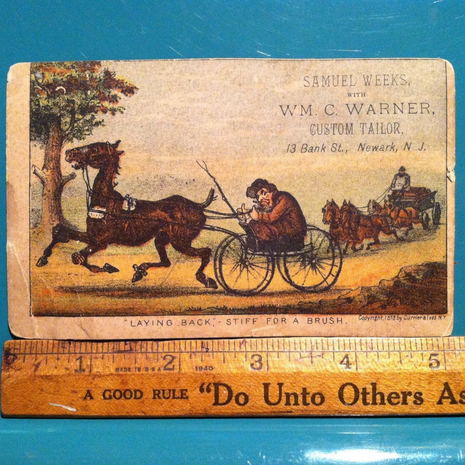 Title (ebay affiliate link): #5 CURRIER AND IVES TRADE CARD,"Laying Back Stiff.",1878,Custom Tailor,Newark NJ