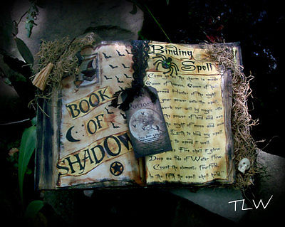 Title (ebay affiliate link): Primitive OOAK Book of Shadows Prop Halloween Witch Faux Spell Book Page Wicca