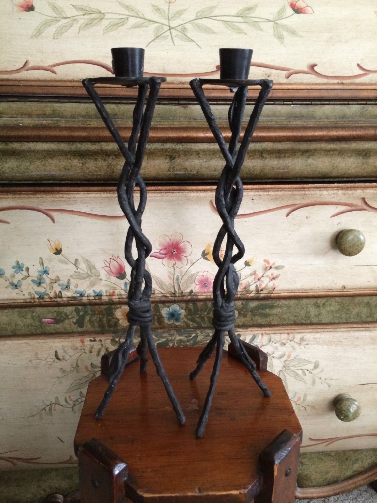 Title (ebay affiliate link): VTG RUSTIC 2 TWISTED/BRAIDED IRON CANDLE STICK HOLDERS 14 1/4" TALL TRIPOD LEGS