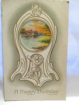 1912 POSTCARD A HAPPY BIRTHDAY, ART DECO ANGEL WITH COUNTRY SCENE