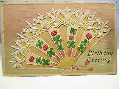 1910 POSTCARD BIRTHDAY GREETINGS, FAN WITH SHAMROCKS