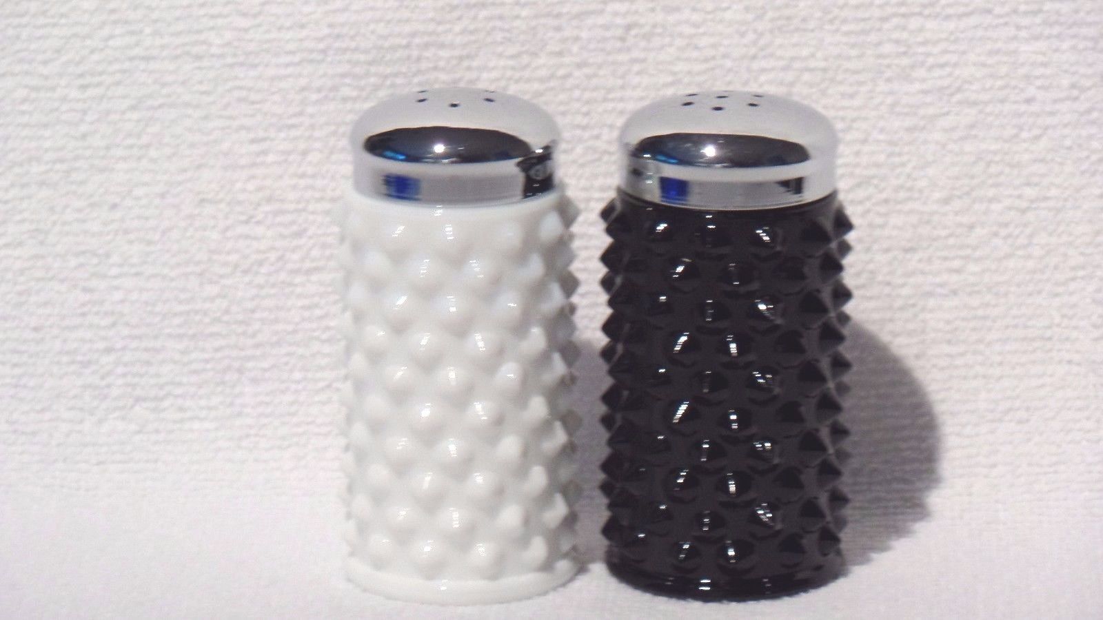 Title (ebay affiliate link): Fenton Milk Glass and Black Glass Hobnail Salt and Pepper Shaker Set 3"