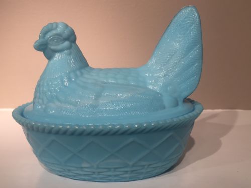 Title (ebay affiliate link): Vintage WESTMORELAND HEN ON NEST BLUE MILK GLASS SPLIT TAIL BASKETWEAVE