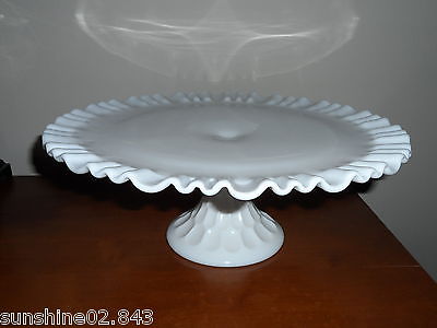 Vintage Fenton Thumbprint Flutted Ruffled Edge Milk Glass Pedestal Cake Plate