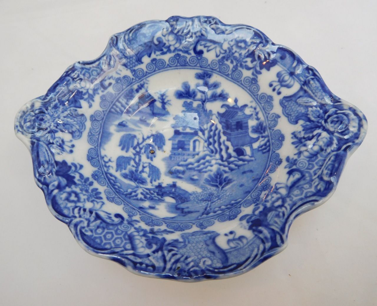 ANTIQUE MASONS CHINA FLOW BLUE / BLUE WILLOW TINY HANDLED DISH / BOWL/CHARMING