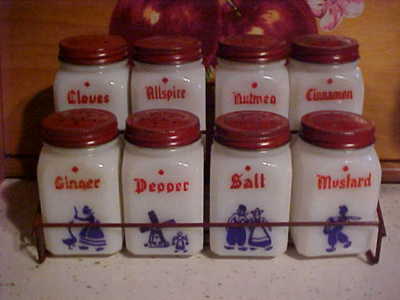 Vintage 8 Dove-Frank Milk Glass Spice Jars in orig rack