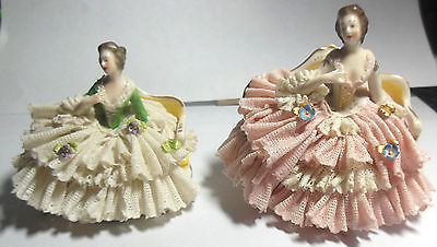 2 PORECLAIN LACE SEATED FIGURINES MADE IN GERMANY