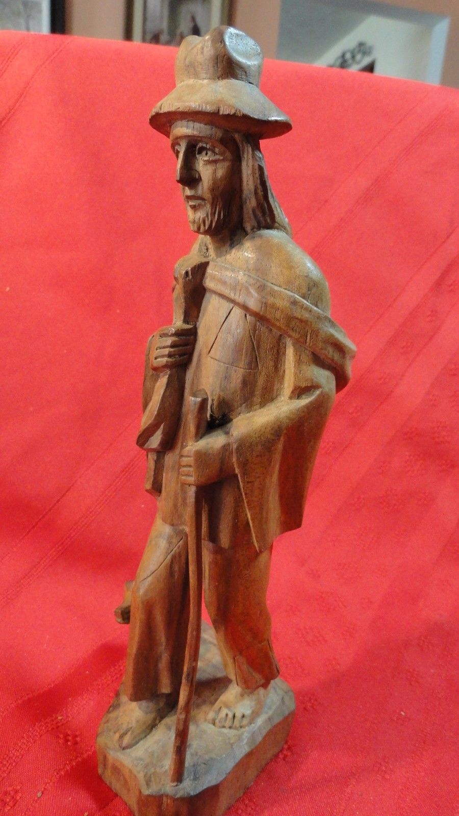 GREAT CARVED WOODEN FIGURE OF BARE FOOT MAN AND HIS DOG