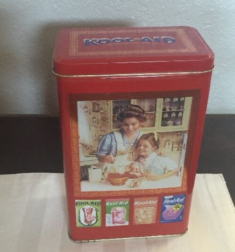 Title (ebay affiliate link): Kool-Aid Sugar Sweetened Soft Drink Mix Canister Metal Tin w Vintage Ads Made UK