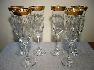 6 Art Deco Crystal Glass Champagne/Wine Flutes Greek Key Pattern Gold Rim
