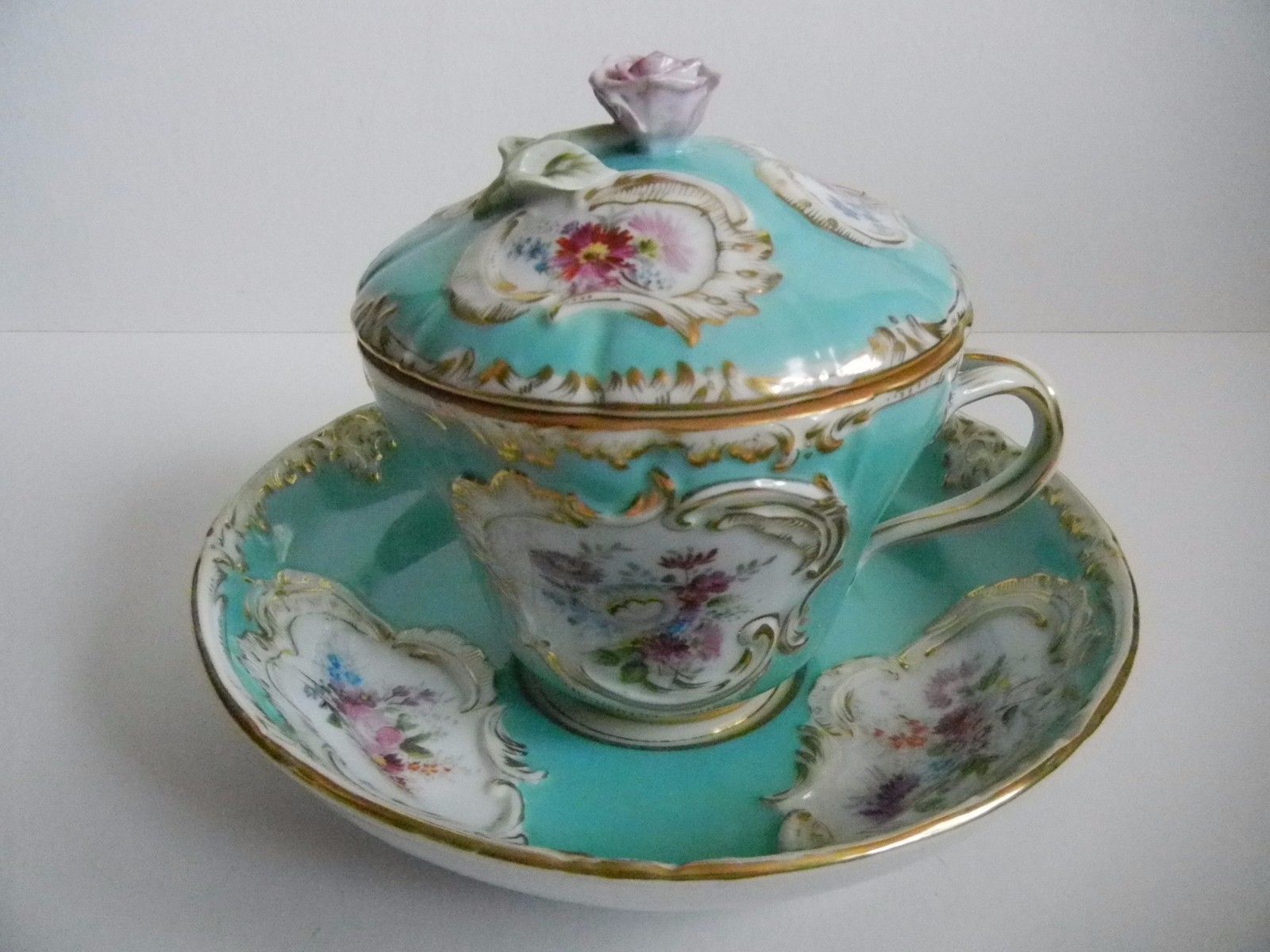 Title (ebay affiliate link): c.1910 3-PC PORCELAIN Turquoise TUREEN Hand-Painted COVERED Applied FLOWER Gold