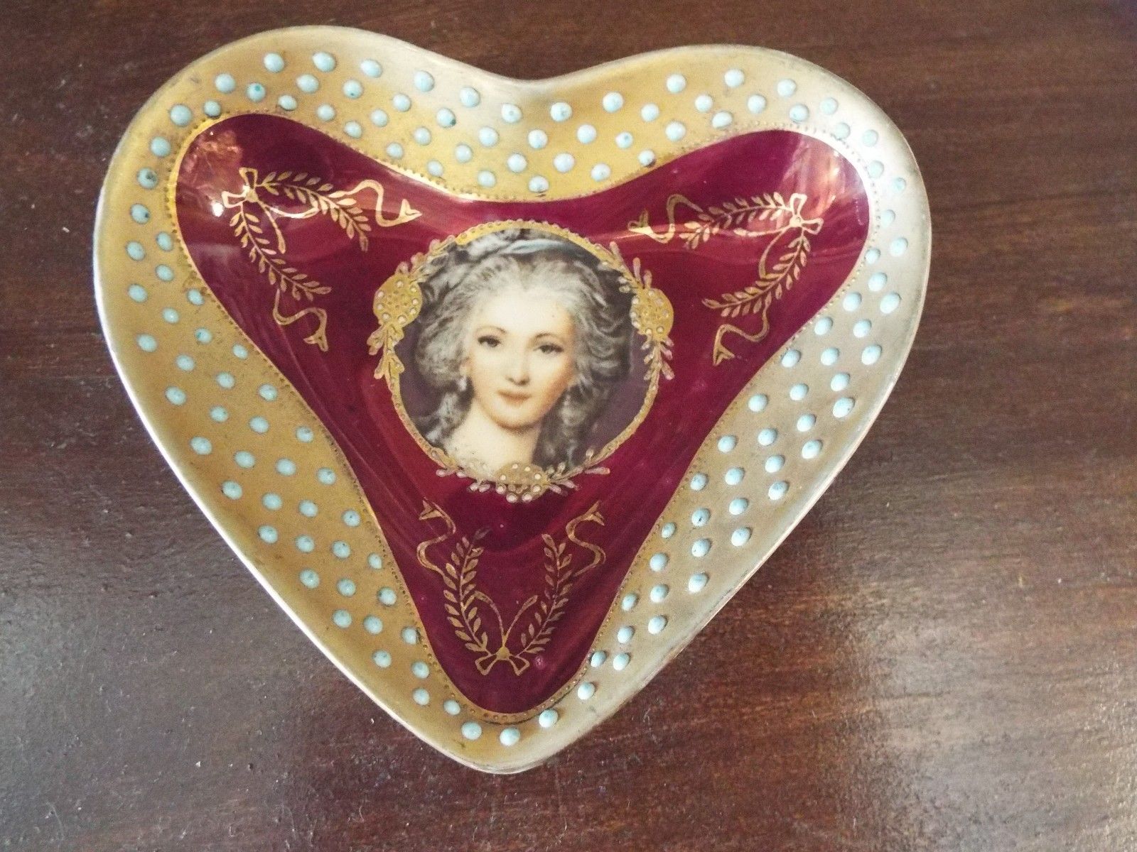 Title (ebay affiliate link): TURQUOISE JEWELED PORCELAIN FRENCH PORTRAIT HEART SHAPED DISH/BOWL NR