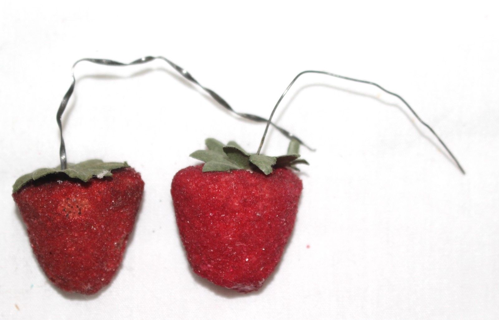 Title (ebay affiliate link): Early 1900s Red Marshmallow Strawberries. Green Paper tops. Crinkly Wire. Great!
