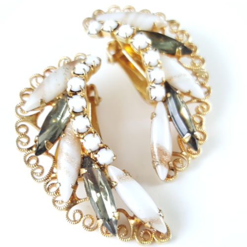 Title (ebay affiliate link): Signed HOBE Vtg Clip Earring Huge Statement Navette Milk Glass Heart Scroll Q72