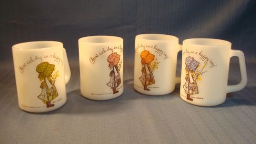 Title (ebay affiliate link): COMPLETE SET OF 4 FEDERAL ~ Holly Hobbie ~ 1972 ~ MILK GLASS SUN BONNET MUGS