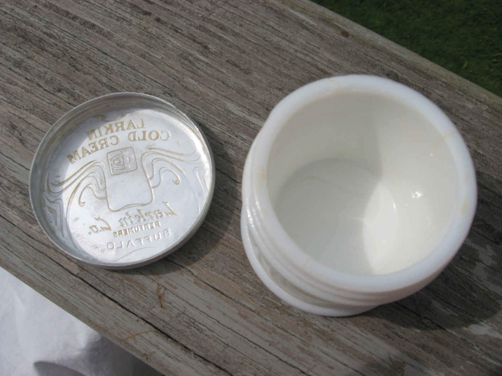 Vintage cold cream jar Larkin Co. Buffalo Milk Glass Aluminum Lid