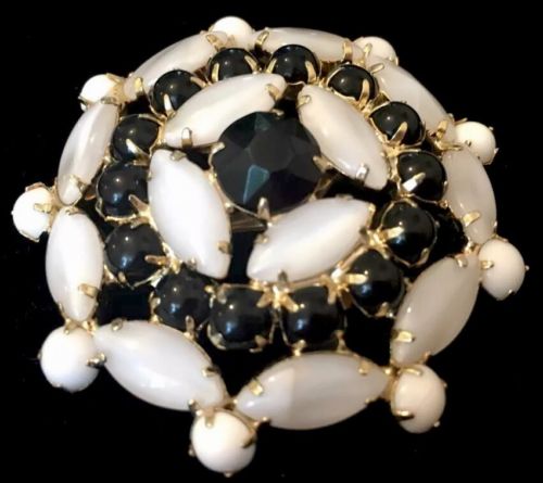 Title (ebay affiliate link): VINTAGE GOLD TONE JET BLACK MILK GLASS OPEN BACK RHINESTONE LARGE A PIN BROOCH