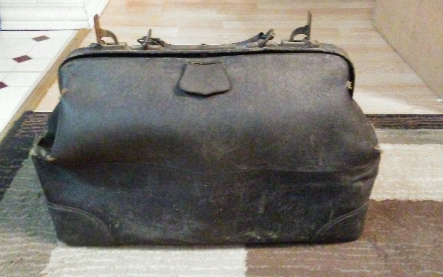 Title (ebay affiliate link): ANTIQUE LEATHER DOCTORS BAG 17" BY 9" BLACK NAUGAHYDE