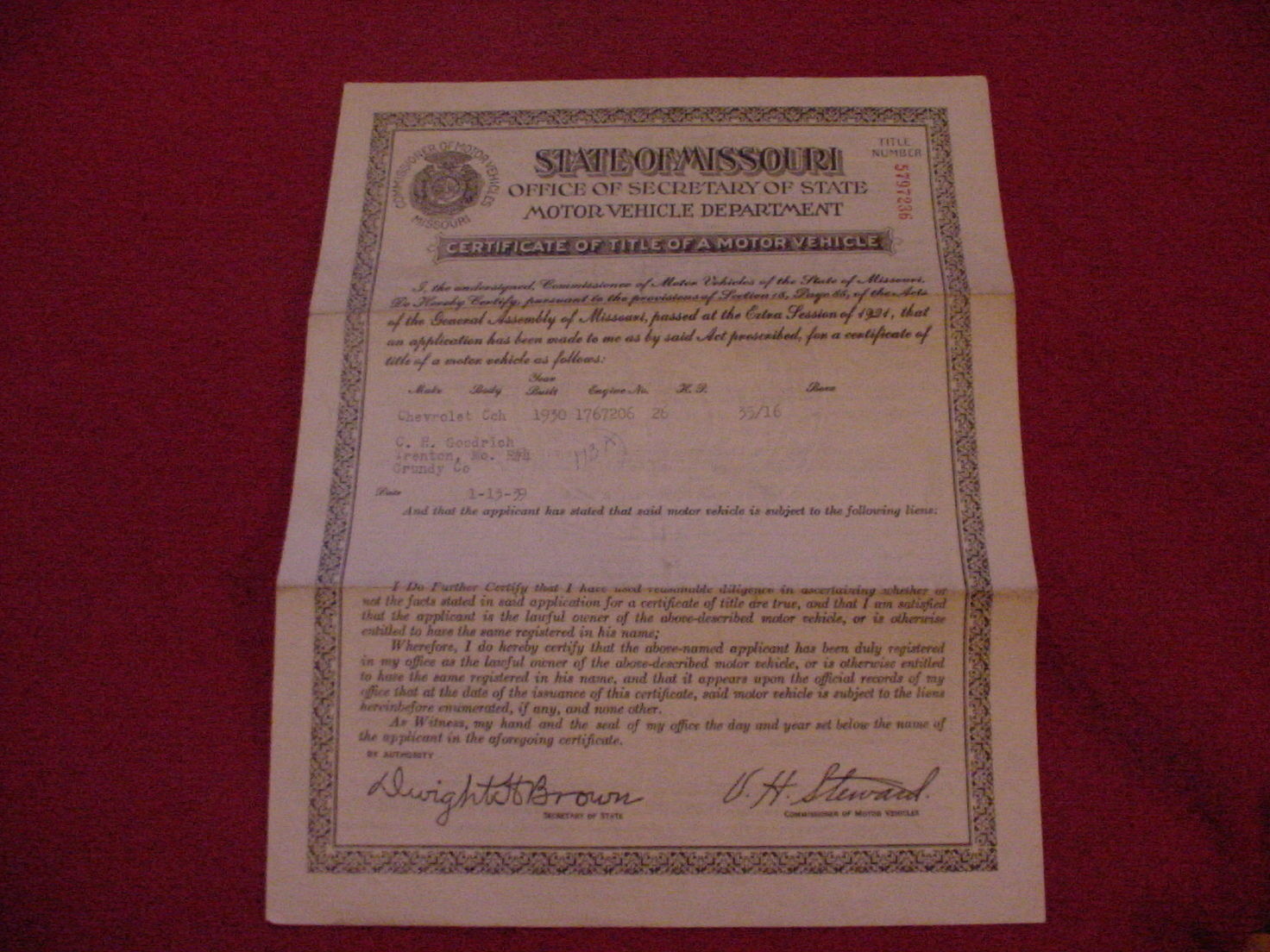 Title (ebay affiliate link): Old Missouri car title for 1930 Chevrolet Coach dated 1939