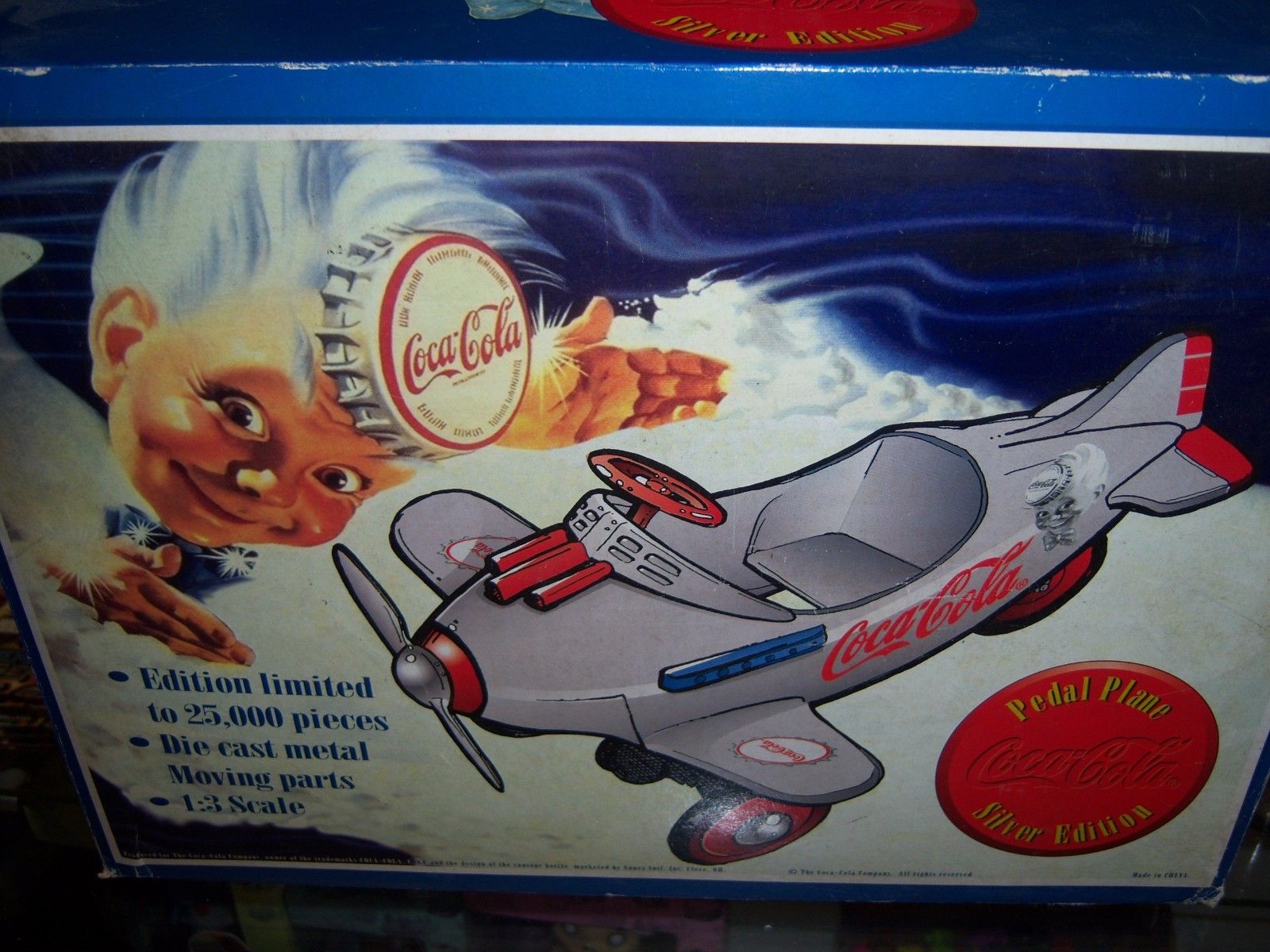 Title (ebay affiliate link): 1:3 scale silver Coca Cola die cast Airplane Pedal Plane (MWB) Pedal Car (1995)
