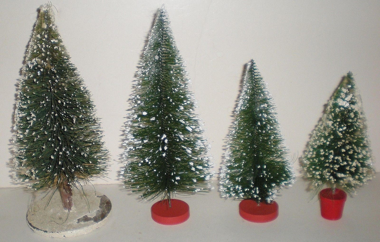 Title (ebay affiliate link): 4 OLD VINTAGE CHRISTMAS SNOW FLOCKED BRUSH TREES - 10" - WOOD BASE